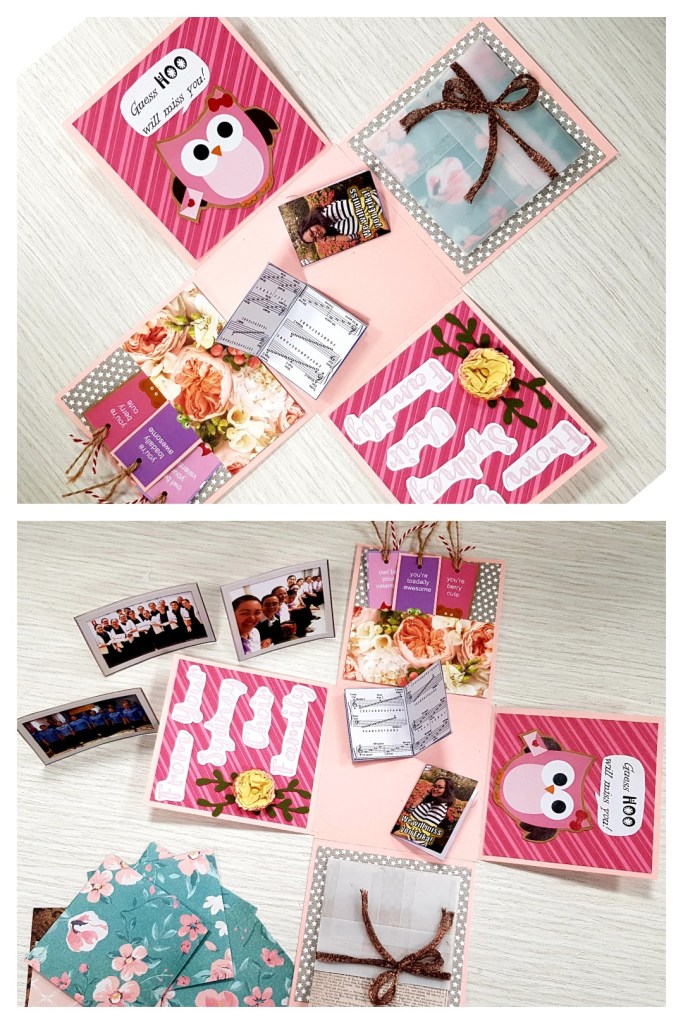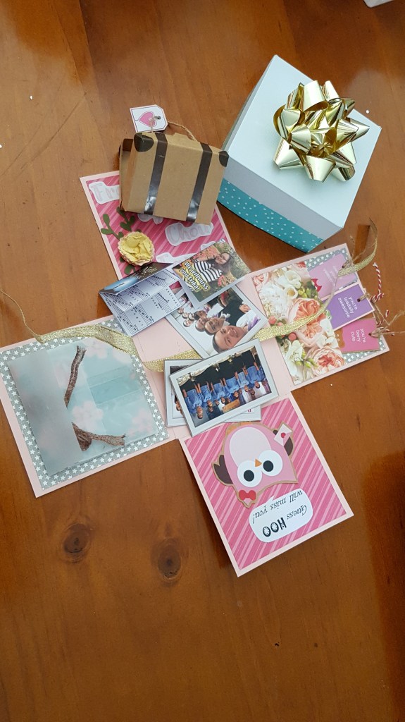 Then I made a miniature suitcase to go in the middle. I also made mini photos of the choir group. I used a large gold foil bow to decorate the blue lid. On one side was an owl that says “Guess HOO will miss you” and on the opposite side was a message “from your Sydney choir family.”