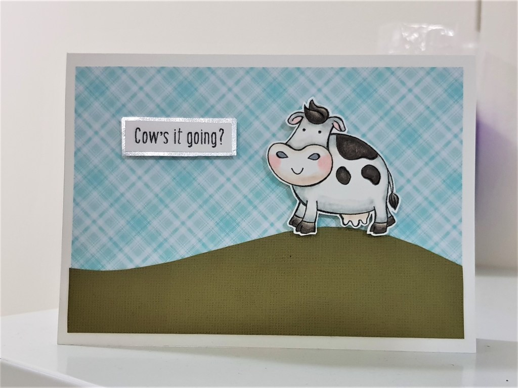 The first card uses the main theme of the stamp and I think the cow’s really cute! It worked well with the dark blue background. The background was really easy to make even for beginners like me.