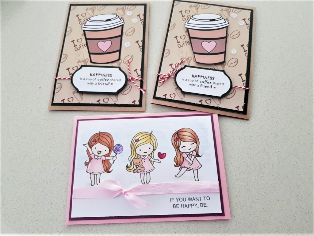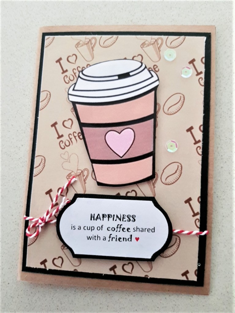 The next card I made is a coffee-themed design. This time, I didn’t use stamps because I don’t have a stamp that’s got a nice big coffee cup. So I had to download and print the background, clipart and sentiment from the internet.