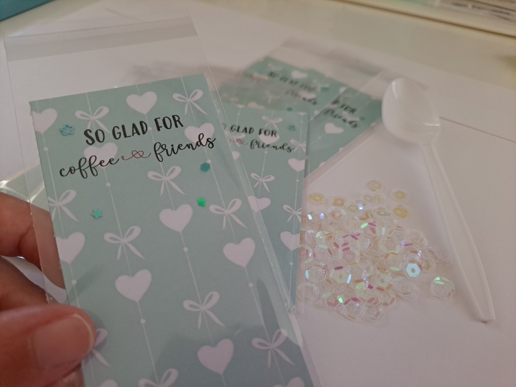 Then, I inserted some sequins at the front of the bookmarks. I only used 12mm sized ones so they don’t go behind the paper. I chose iridescent and about 3 or 4 pcs of teal coloured ones to make them pop out.