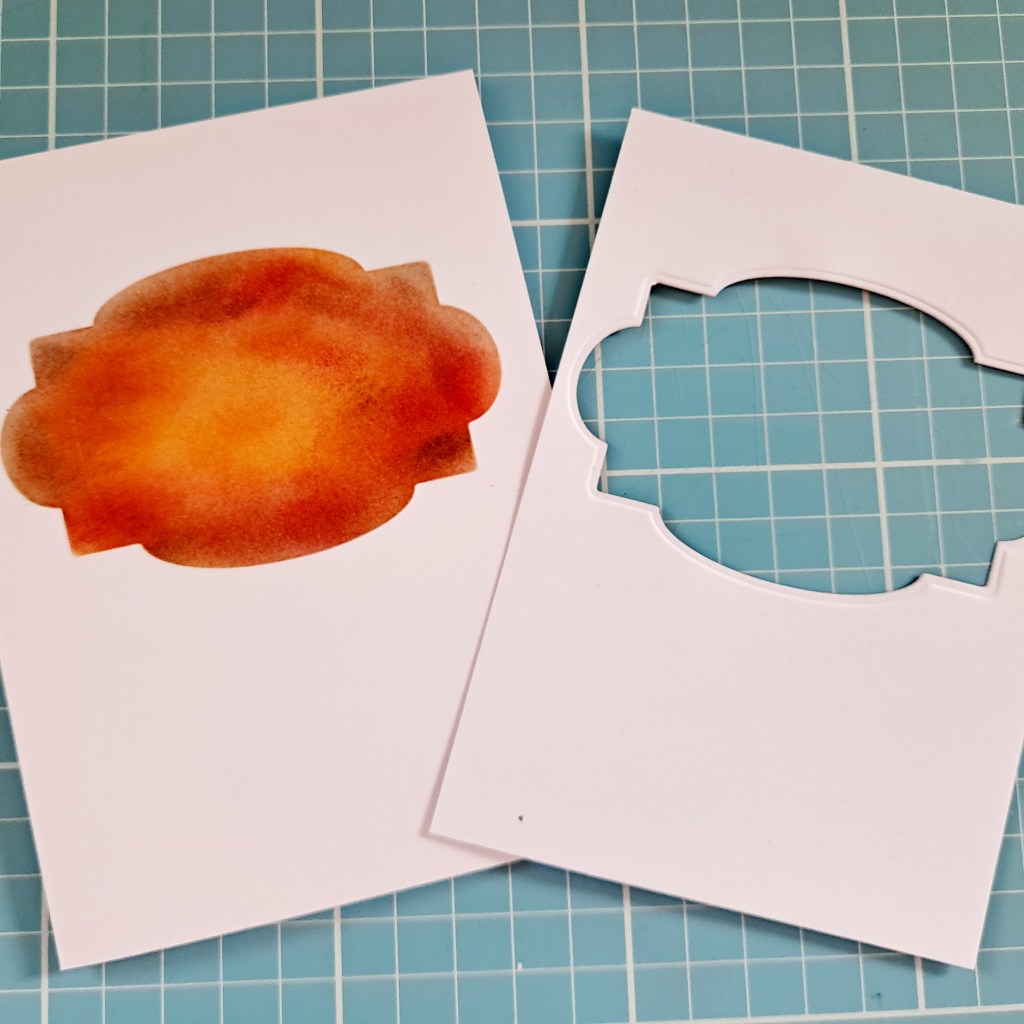 Using the off-cut from the window card, I coloured it with dark autumn shades. The inks I used were as follows, but feel free to use your own preferred brands.