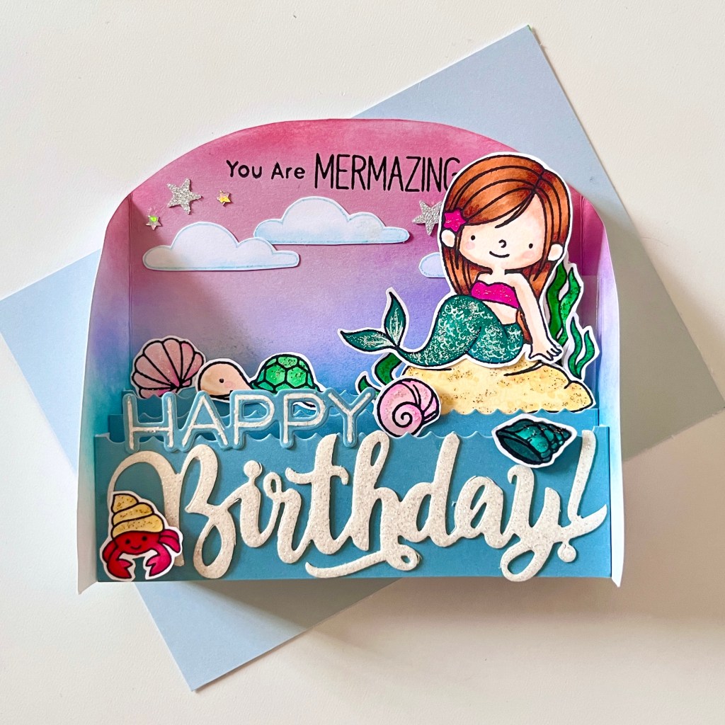 Because I enjoyed making the pop up birthday box card, I decided to make another one this time using my favourite MFT stamp sets, BB Mermazing! I used a similar format as with my 3rd handmade birthday card design but I stepped it up a bit and added a swish and pop interactive feature.