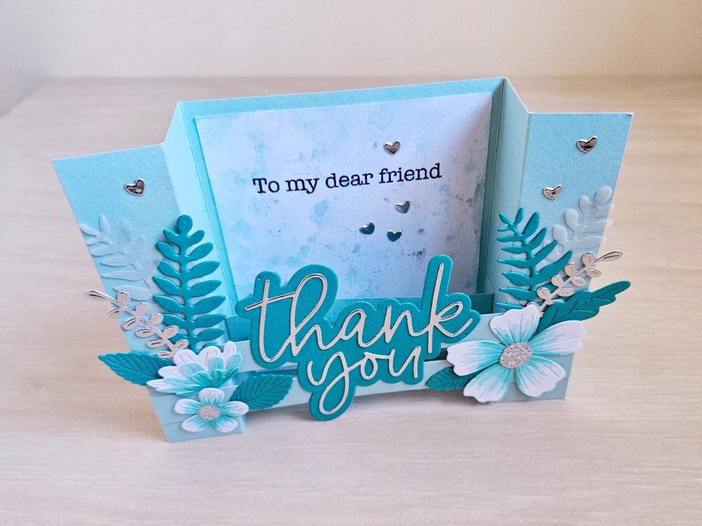 Hello everyone! I’m back with another pop up card using bridge fold technique, which is a really interesting cardmaking design. I mixed and matched various supplies for this card and kept the colour scheme to teal and silver.