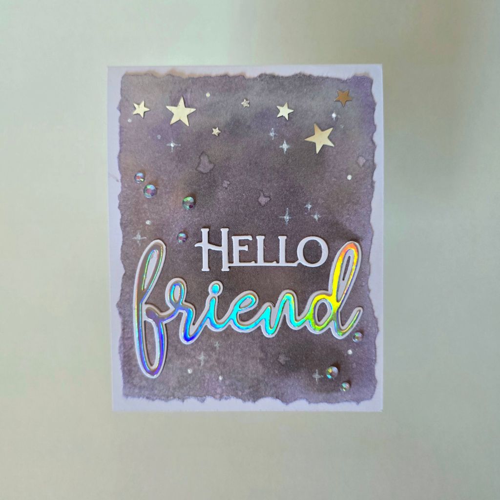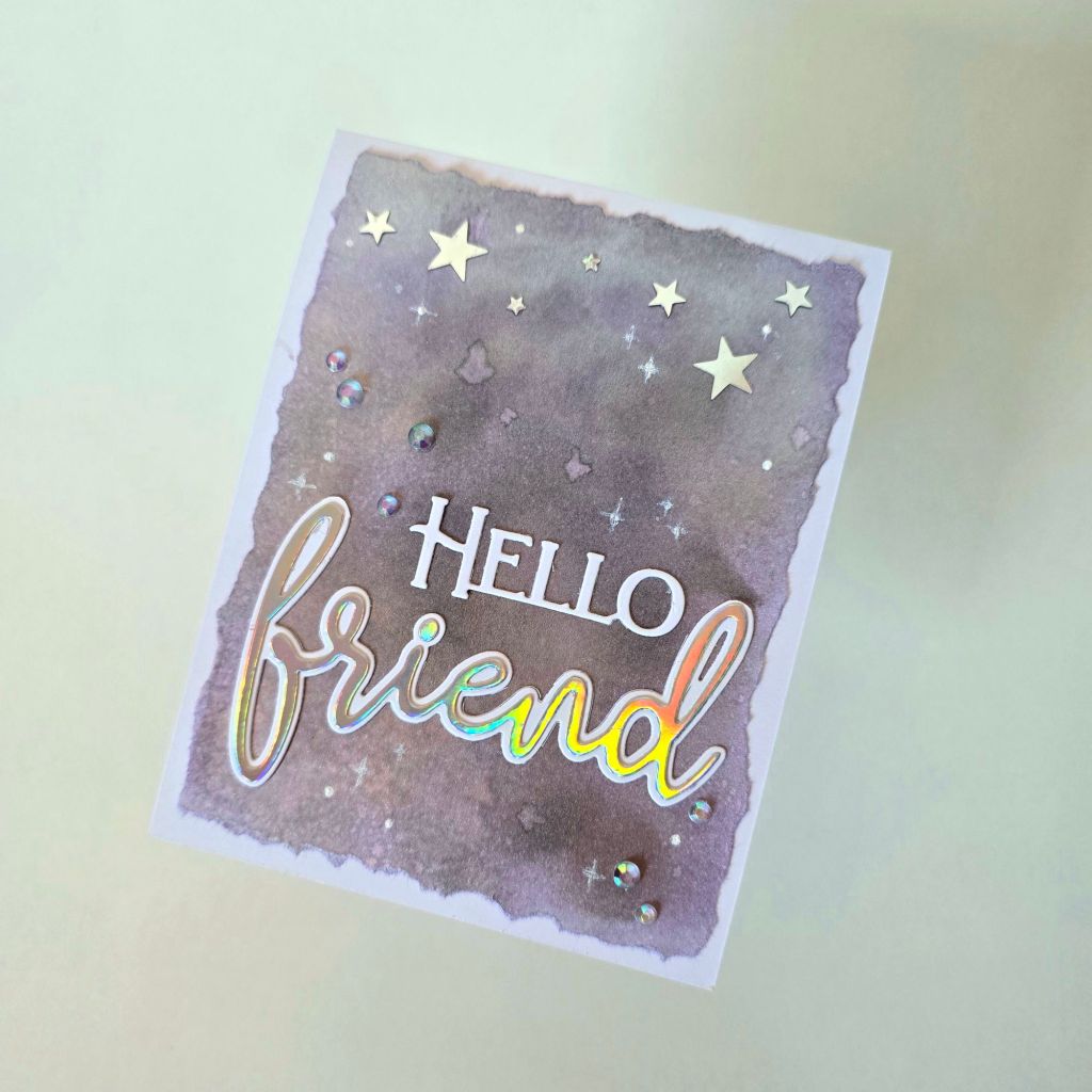 Also using a blending brush, I added a white pearl powder on top very lightly for a pearlescent effect. I used a white gel pen to add shimmering stars and also some rhinestones and silver star sequins. The word HELLO is from Poppystamps die set and the word friend was from Altenew Thank You For Being My Friend die set.