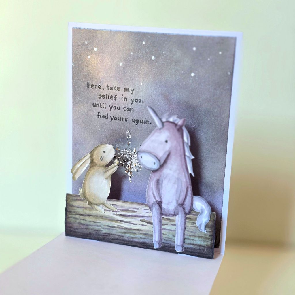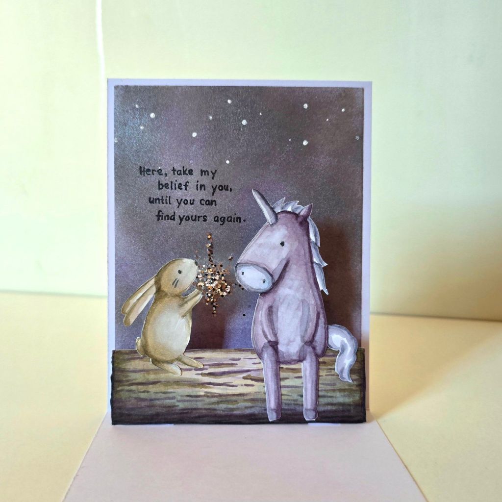 I drew the images of the bunny, unicorn, and log myself, and coloured them using Ohuhu Alcohol Ink Markers. I used a prop behind the log for a pop-up mechanism to give the inside scene some dimension. You can refer to my pop-up card tutorial on how to create this pop-up mechanism.