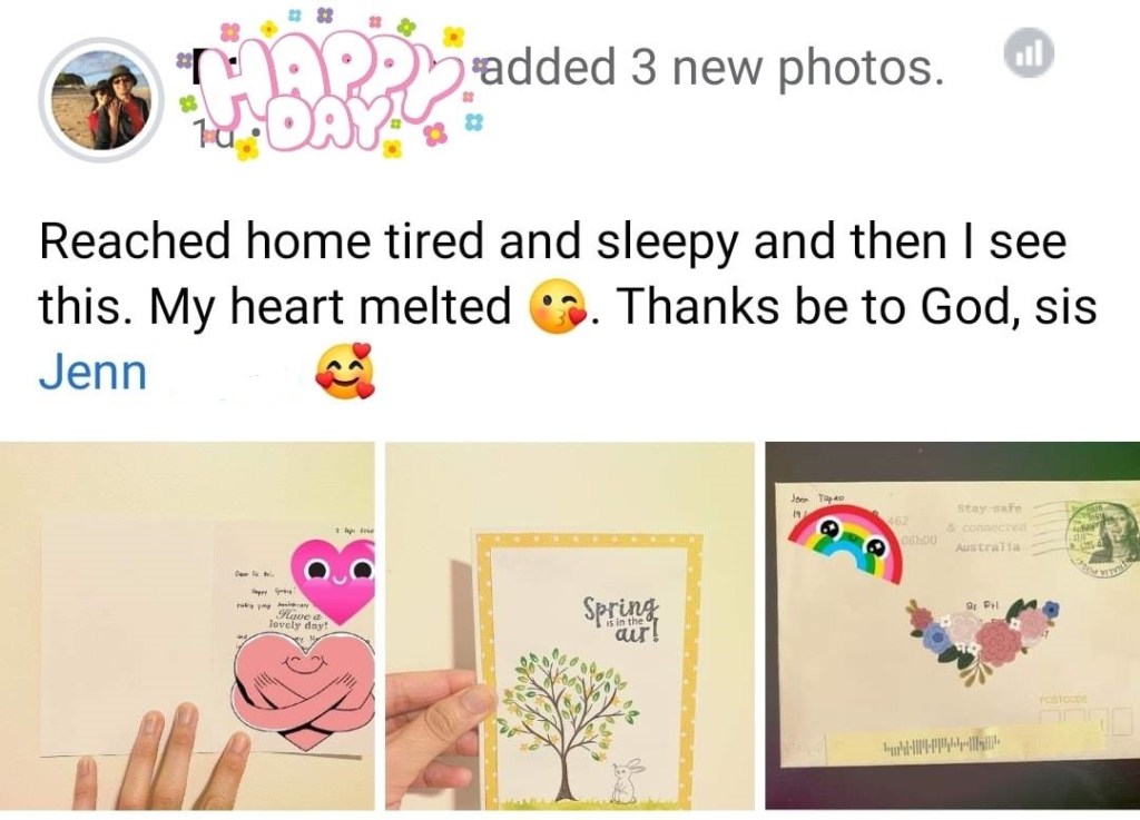 If you want to be part of sending hugs in a card mission, click the envelope below and fill in your details to receive a free happy mail. It doesn’t matter where you are in the world, anyone can participate.