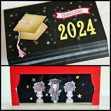It’s the last day of September! I’m sharing another graduation card I made for a friend’s daughter. She wanted a bigger sized card so I made this A5 sized. I kept the frontt design simple: a cap with a realistic tassel, “Congratualtions” stamped on a wavy banner, 2024 number dies, and some white and gold … More Graduation Pop Up Frame Card